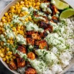 Keywords: Street Corn, Chicken Rice Bowl, Skillet Chicken, Cilantro Lime Sauce, Quick Dinner, One-Pan Meal