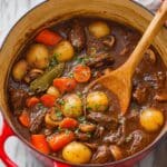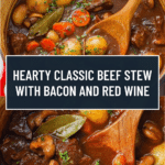 This hearty Beef Stew recipe combines tender chunks of beef, crispy bacon, mushrooms, carrots, and potatoes simmered in a rich red wine and beef broth mixture. Slow-baked to perfection in the oven, it’s a comforting dish perfect for chilly days or family dinners.