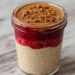 A delicious and creamy Biscoff Overnight Oats recipe combining rolled oats soaked in milk and yogurt, layered with fresh mashed raspberries, and topped with melted Lotus Biscoff spread and crumbled Biscoff biscuit for a satisfying no-cook breakfast or snack.