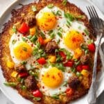 PrintBreakfast Pizza with Hash Brown Crust and Baked Eggs Recipe