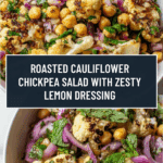 A vibrant and healthy Chickpea and Roasted Cauliflower Salad featuring tender roasted cauliflower florets, protein-packed chickpeas, fresh herbs, and a zesty lemon garlic dressing. Perfect as a light lunch or side dish, this salad combines wholesome ingredients for a flavorful, nutritious meal.