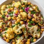 A vibrant and healthy Chickpea and Roasted Cauliflower Salad featuring tender roasted cauliflower florets, protein-packed chickpeas, fresh herbs, and a zesty lemon garlic dressing. Perfect as a light lunch or side dish, this salad combines wholesome ingredients for a flavorful, nutritious meal.