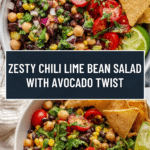 A refreshing and zesty Chili Lime Bean Salad featuring a hearty mix of chickpeas, black beans, roasted corn, and vibrant veggies tossed in a tangy lime vinaigrette with smoky spices, perfect for a light lunch or side dish.