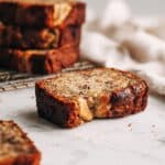 The image shows a single slice of moist banana bread lying flat on a white marbled surface. The bread has two visible layers: a darker, caramelized crust with a rough texture on the sides and top, and a lighter, soft interior speckled with small dark spots throughout. A bite is taken out of one corner, revealing the dense but crumbly texture inside. In the slightly blurred background, more slices of the same banana bread are stacked on a white cloth on a wire rack, maintaining a cozy and warm atmosphere. photo taken with an iphone --ar 4:5 --v 7