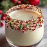 A close-up of a white creamy drink in a clear glass with a thick rim covered in small round sprinkles in red, green, white, and a little gold. The drink fills most of the glass, showing its smooth texture and light ivory color. The glass sits on a white marbled surface with blurred red and green holiday decorations in the soft background, creating a festive look. photo taken with an iphone --ar 4:5 --v 7