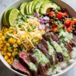 These Cilantro Lime Steak Bowls are a vibrant and flavorful meal featuring perfectly marinated and seared flank steak served over a bed of zesty cilantro lime rice, black beans, and charred corn. Complemented by fresh veggies, creamy avocado, shredded cheese, and a tangy cilantro lime dressing, this bowl is a balanced and satisfying dish ideal for a hearty lunch or dinner.