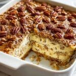 A white square baking dish filled with a layered dessert that has been cut to show the inside. The bottom layer is creamy and pale yellow with a smooth texture, mixed with bits of light brown nuts. Above it is a thicker layer of light brown with a crumbly texture, studded with more nuts and cinnamon-like dusting. The top layer is a darker golden brown, covered with whole pecans scattered evenly. The edges of the dessert look soft and rich, with some crumbs fallen inside the dish. The dish sits on a white marbled surface. photo taken with an iphone --ar 4:5 --v 7