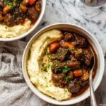 Store leftover Beef Bourguignon in an airtight container in the refrigerator for up to 3 days. The flavors improve after sitting overnight. Reheat gently on the stovetop over low heat, adding a splash of broth if needed. This dish also freezes well for up to 3 months; thaw overnight in the fridge before reheating.