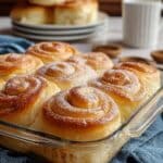 A glass baking dish sits on a navy blue cloth over a white marbled surface, filled with six golden brown spiral rolls arranged in two rows of three. Each roll shows layered, flaky dough with a shiny, slightly crisp top, dusted lightly with powdered sugar. The swirls reveal a soft, fluffy inside with a light cream color beneath the shiny crust. In the blurry background, stacked white plates hold more of the same rolls, adding depth to the warm, cozy setting. Photo taken with an iphone --ar 4:5 --v 7