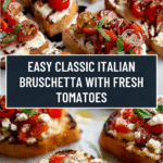 This Classic Italian Bruschetta recipe features ripe Roma tomatoes marinated with fresh basil, balsamic vinegar, and olive oil, served on toasted crusty Italian bread topped with mozzarella or ricotta cheese. It’s a vibrant and flavorful appetizer that balances fresh, tangy tomato topping with the crunch of toasted bread and a creamy cheese layer, perfect for entertaining or a light snack.