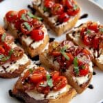This Classic Italian Bruschetta recipe features ripe Roma tomatoes marinated with fresh basil, balsamic vinegar, and olive oil, served on toasted crusty Italian bread topped with mozzarella or ricotta cheese. It’s a vibrant and flavorful appetizer that balances fresh, tangy tomato topping with the crunch of toasted bread and a creamy cheese layer, perfect for entertaining or a light snack.