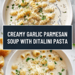 Enjoy a rich and comforting Creamy Garlic Parmesan Soup that’s perfect for cozy meals. This delicious soup combines the flavors of garlic, Italian seasoning, and creamy Parmesan with tender ditalini pasta, all cooked in a luscious chicken stock and cream base for a hearty and savory dish.