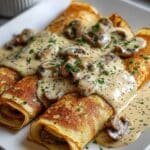 Crêpes Roulées Poulet, Champignons, Béchamel is a comforting French dinner that combines tender crepes filled with savory chicken and mushrooms, all smothered in a creamy béchamel sauce. This dish is perfect for a cozy evening meal that feels both elegant and homey.