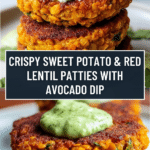 These Crispy Sweet Potato & Red Lentil Patties are a deliciously nutritious vegetarian snack or light meal. Combining soft red lentils with sweet grated potato and aromatic spices, these patties are pan-fried to golden perfection and served with a creamy avocado cilantro sauce that adds a refreshing tangy finish.