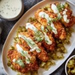 Marinating in pickle juice adds a unique tang and tenderizes the chicken, but if you’re short on time, you can skip this step. The dish will still be delicious with the breadcrumb coating and sauce.