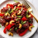 Dragon Chicken is a flavorful Indo-Chinese stir-fried dish featuring crispy breaded chicken strips tossed in a spicy, tangy sauce with cashews and vibrant vegetables. The chicken is marinated with aromatic spices, coated in a crunchy breading, pan-fried to perfection, and then combined with a savory-sweet chili sauce and toasted cashews for a delightful blend of textures and tastes.