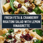 A fresh and vibrant Feta & Cranberry Rigatoni Salad featuring tender rigatoni pasta tossed with tangy crumbled feta, sweet dried cranberries, crunchy toasted walnuts, and fresh baby spinach, all brought together with a zesty lemon vinaigrette dressing. Perfect for a light lunch or a colorful side dish.