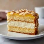 German Bee Sting Cake (Bienenstich Kuchen) is a classic dessert featuring a soft yeast dough base topped with a caramelized honey-almond mixture. It is filled with a light and creamy blend of whipped cream and smooth vanilla custard, creating a perfect balance of nutty sweetness and creamy texture.