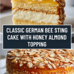 German Bee Sting Cake, or Bienenstich Kuchen, is a delightful dessert featuring a sweet yeast dough topped with honeyed almonds and filled with a creamy custard whipped cream mixture. Its combination of crunchy topping and smooth filling makes it a beloved treat for any occasion.