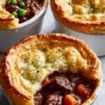 A classic hearty and comforting Hairy Bikers Steak and Guinness Pie featuring tender beef stewed in rich Guinness stout and beef stock, combined with aromatic vegetables, then topped with golden puff pastry and baked to perfection.