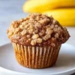 A close-up of a single textured muffin placed in the center of a white plate, showing a light brown spongy base with vertical ridges and a top layer filled with crumbly oat clusters and a slightly darker, crunchy surface. The background is softly blurred with yellow bananas, and the plate sits on a white marbled texture surface. photo taken with an iphone --ar 4:5 --v 7