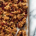 Press the granola firmly down into the pan halfway through baking and avoid stirring too much. This helps the oats and nuts stick together in clusters.