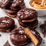 - Dip the Eggs: Dip each frozen peanut butter egg top-down into the melted chocolate. Use a fork to carefully flip the egg over, lift it out, and gently shake off excess chocolate. Scrape the bottom on the side of the bowl to remove any drips. Place the coated eggs back onto the sheet pan. Drizzle additional melted chocolate over the eggs and sprinkle with flaky sea salt if desired. The cold peanut butter filling will help the chocolate set quickly.