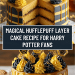 A delightful homemade Hufflepuff’s Layer Cake featuring moist yellow cake layers tinted with gel food coloring, rich black chocolate ganache, and smooth yellow buttercream frosting. Decorated with edible gold dust and a Hufflepuff house crest topper, this cake is perfect for Harry Potter fans and festive occasions.