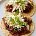 Two small white corn tortillas lay flat on a white plate with a white marbled background. Each tortilla holds a thick layer of dark brown, shredded, saucy meat covering most of its surface. On top of the meat, there is a layer of creamy coleslaw mixed with small pieces of orange carrot and pale green and purple cabbage. Scattered bright green sliced scallions decorate the coleslaw and meat, adding fresh color contrast. The overall texture is soft and juicy from the meat with a creamy crunch from the coleslaw. Photo taken with an iphone --ar 4:5 --v 7
