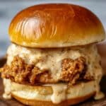 A close-up view of a fried chicken sandwich with three main layers. The bottom layer is a soft, white bun with a slightly toasted edge. On top of the bun sits a thick piece of crispy fried chicken coated in a golden brown crust with a rough texture. The chicken is covered in light beige creamy sauce with specks of spices, dripping slightly over the sides. The top layer is a shiny, smooth, golden brown bun that crowns the sandwich. The sandwich sits on a wooden surface with a white marbled texture blurred in the background. photo taken with an iphone --ar 4:5 --v 7