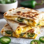 This Jalapeno Popper Quesadillas recipe combines the creamy, spicy flavors of jalapenos and cream cheese with crispy bacon and gooey melted cheeses inside a warm, toasted flour tortilla. Perfect as a delicious appetizer or snack that brings together the zest of jalapenos with savory bacon and a blend of mozzarella and Monterey Jack cheeses, all quickly cooked on the stovetop for a crunchy, melty treat.