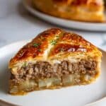 A slice of meat pie shows three layers: the top layer is a shiny, golden-brown puff pastry with a slightly crisscrossed pattern and small green herb flakes on it; below that is a thick, crumbly layer of cooked ground meat mixed with small green herbs, and the bottom layer is a layer of cooked, small translucent diced onions. The slice is on a plain white plate placed on a white marbled surface, with a blurred part of another pie visible in the background. Photo taken with an iphone --ar 4:5 --v 7