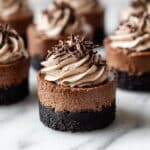 Mini Triple Chocolate Cheesecakes are a decadent treat featuring a rich Oreo crust, a silky chocolate cheesecake filling, a smooth dark chocolate ganache topping, and a luscious chocolate whipped cream garnish. Perfectly portioned as individual servings, these cheesecakes blend the deep flavors of dark, semi-sweet, and cocoa chocolate in every bite, offering a deliciously creamy and indulgent dessert.