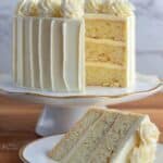 Keywords: vanilla almond cake, moist vanilla cake, almond buttercream, vanilla cake recipe, layered cake, white chocolate ganache