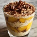 This Peach Cobbler Overnight Oats recipe combines the comforting flavors of caramelized peaches, cinnamon, and toasted pecans with creamy almond milk-soaked oats. Prepared by layering warm, sweetened peaches and oat mixture, then refrigerated overnight, it makes a delicious, wholesome, and easy-to-make breakfast that’s perfect for busy mornings or a nutritious snack.