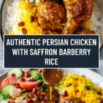 Persian Chicken (Zereshk Polo Ba Morgh) is a traditional Iranian dish featuring tender, spiced chicken simmered in a fragrant saffron and tomato sauce, served alongside fluffy basmati rice mixed with tart barberries and a refreshing Shirazi salad of cucumber, tomato, and red onion with lemon and mint.