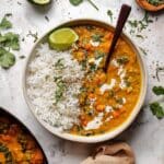 Store leftover pumpkin curry in an airtight container in the refrigerator for up to 3 days. Reheat gently on the stove or in the microwave, adding a splash of vegetable broth or water if the curry has thickened. This curry also freezes well for up to 2 months; thaw overnight in the fridge before reheating.