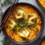Store any leftover soup in an airtight container in the refrigerator for up to 3 days. When reheating, warm gently on the stove over low heat to prevent the coconut milk from separating. Dumplings may absorb more broth upon storing, so you might want to add a splash of vegetable broth or water when reheating to loosen the soup.