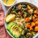 This wholesome Quinoa and Veggie Power Bowl combines roasted Brussels sprouts and butternut squash with fluffy quinoa and kale, topped with a tangy homemade dressing and optional avocado slices. Perfect for a nutritious and satisfying meal packed with flavor and vibrant textures.