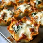 The image shows several baked mini lasagna cups on a metal baking tray. Each cup has a golden, crispy outer layer made from a thin pasta sheet shaped like a small open square bowl. Inside, there are layers of melted white cheese that looks gooey and slightly browned around the edges, with visible pieces of green spinach and browned bits of sausage evenly spread underneath the cheese. The pasta edges are puffed and browned, adding texture contrast. The cups are arranged closely on the tray, and the tray is placed on a white marbled surface. photo taken with an iphone --ar 4:5 --v 7