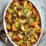 A white oval dish filled with a baked bread casserole showing about two layers of cubed golden-brown toasted bread mixed with melted cheese. Scattered across the top are thin light green rings of sliced leeks and bits of caramelized dark brown onions, adding texture and color. Sprigs of fresh green herbs are sprinkled on top, giving a fresh look. The dish sits on a white marbled surface with a silver spoon and fork beside it. Photo taken with an iphone --ar 4:5 --v 7