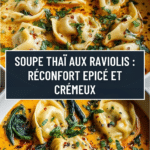 A comforting Thai-inspired soup featuring flavorful red curry, tender frozen raviolis, and a rich coconut broth, finished with fresh spinach and aromatic herbs for a warming and satisfying meal.