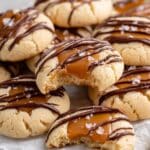 These Twix Thumbprint Cookies are buttery and tender with a chewy caramel center and a drizzle of smooth milk chocolate. Perfectly chilled and baked to crisp edges, these cookies capture the nostalgic flavors of a Twix bar with a soft cookie base, rich caramel filling, and a chocolate finish topped with flaky sea salt.